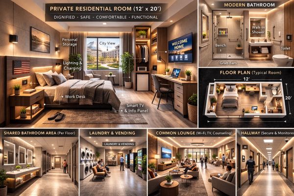 Once accepted into the program, each client will be assigned temporary housing within the facility based on gender and marital status until their Phase 1 program is completed. Phase 1 is a 12-month rehabilitation process. The facility is equipped to house 400 single men, 400 single women, and 200 couples. Families will be housed in a separate building.